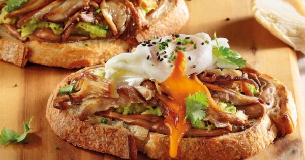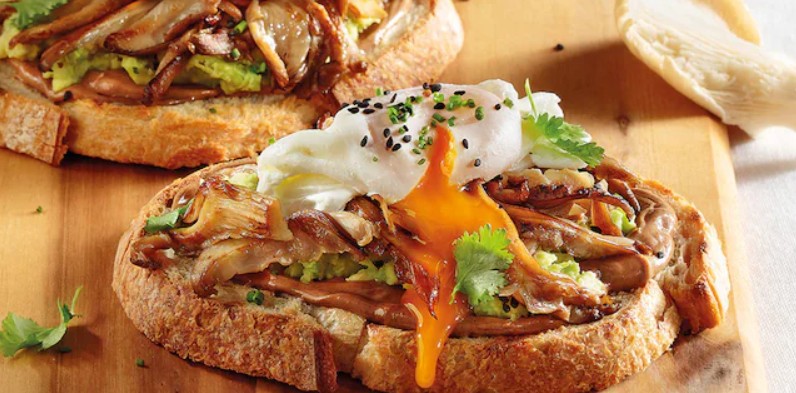 Μπρουσκέτες με πλευρώτους, αμυγδαλοβούτυρο, αβοκάντο και αβγό ποσέ